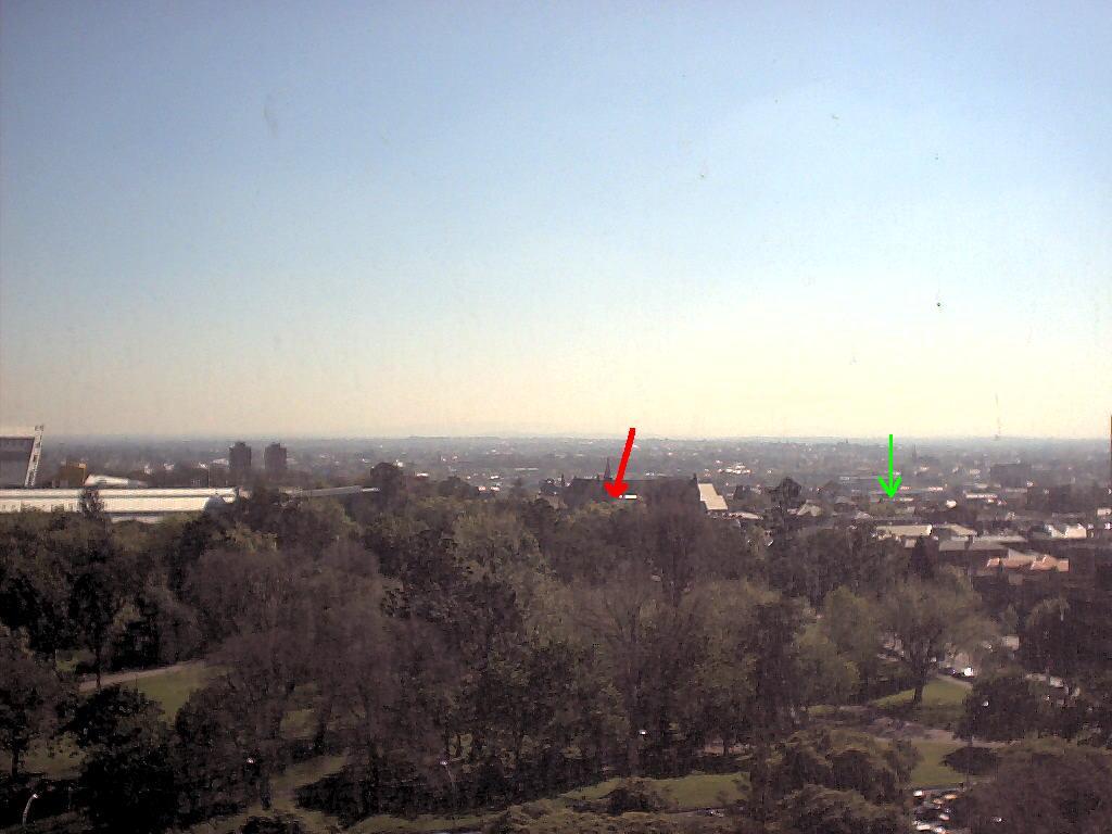 5.8Ghz is very picky about how far it will will go. It can pass through things like glass, wood and plaster but has problems with metal and trees. The pictures below are from my initial experiments. My AP (Access Point) is sitting at work pointed out a 11th story window in the direction of my house. I have three SU (Subscriber Units). One is at my house (the red arrow), one it on a ten foot pole at a friends place (green arrow).